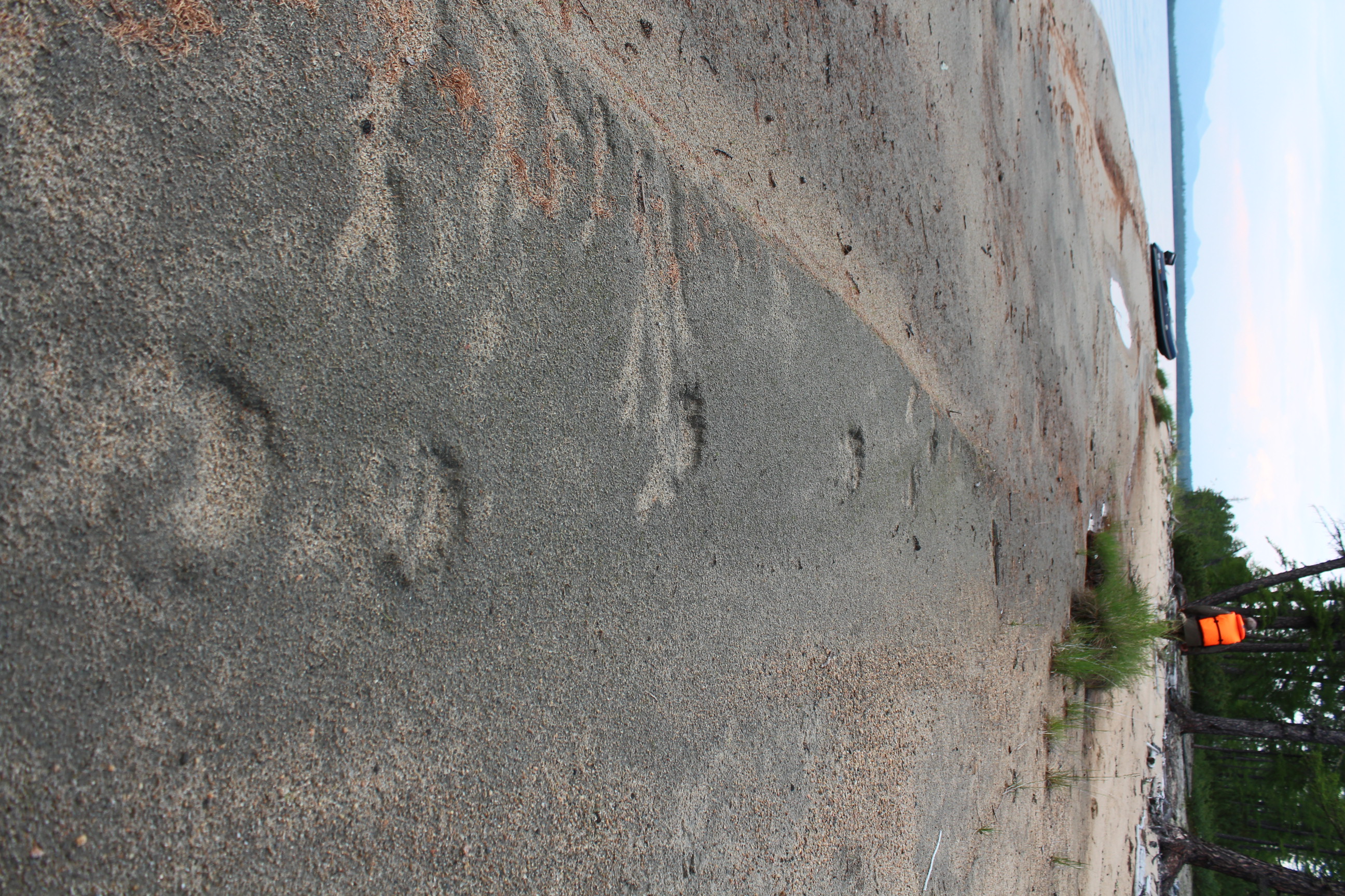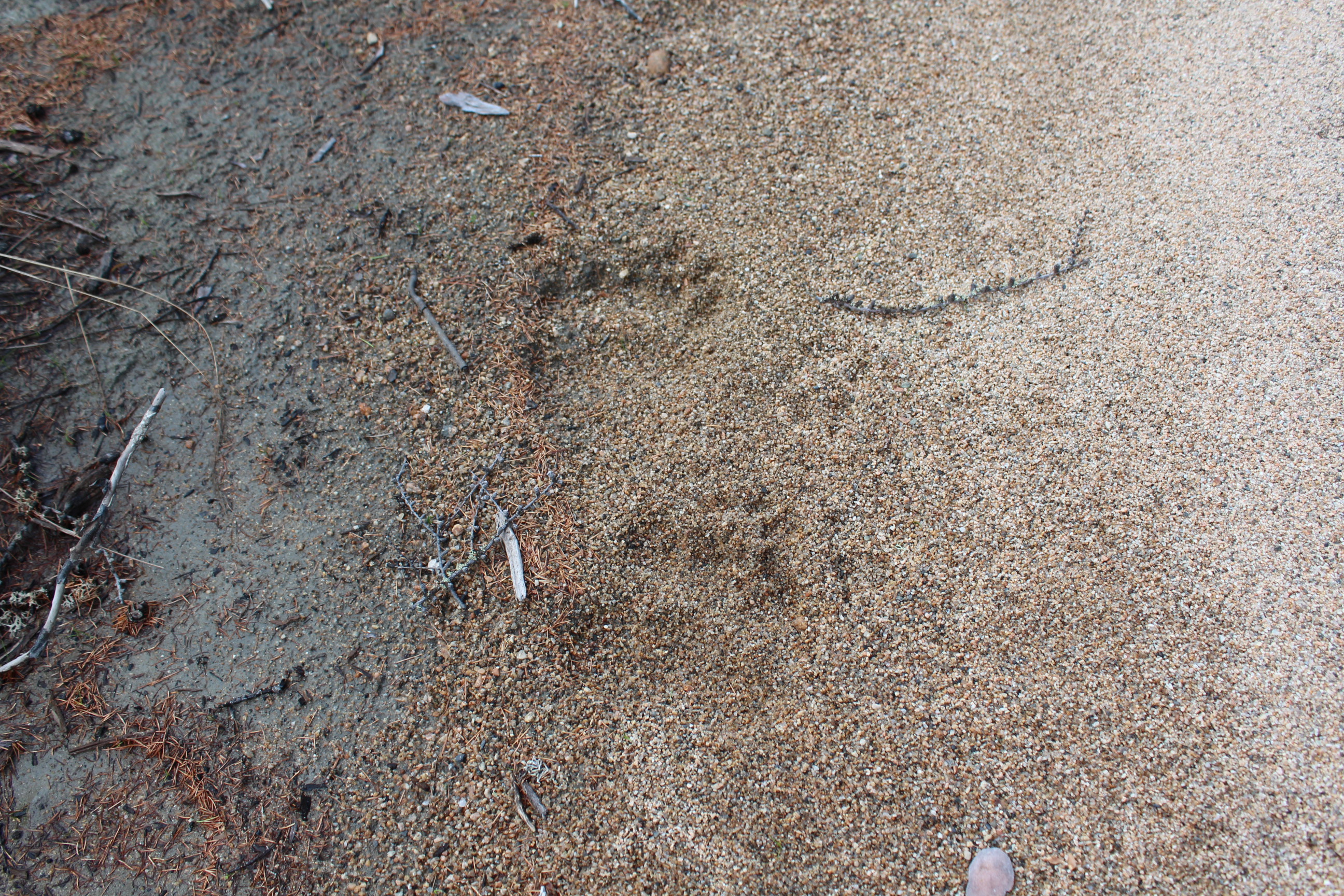 При патрулировании территории парка на оз. Б. Леприндо в теплое время года сотрудники парка, а так же туристы и гости, всегда могут увидеть следы хозяев тайги вдоль береговой линии. Вот здесь прошел совсем маленький медвежонок, мамины следы параллельно чуть в стороне. А вот здесь: уже большой медведь– его след не уступает 42-му человеческому размеру длины стопы.