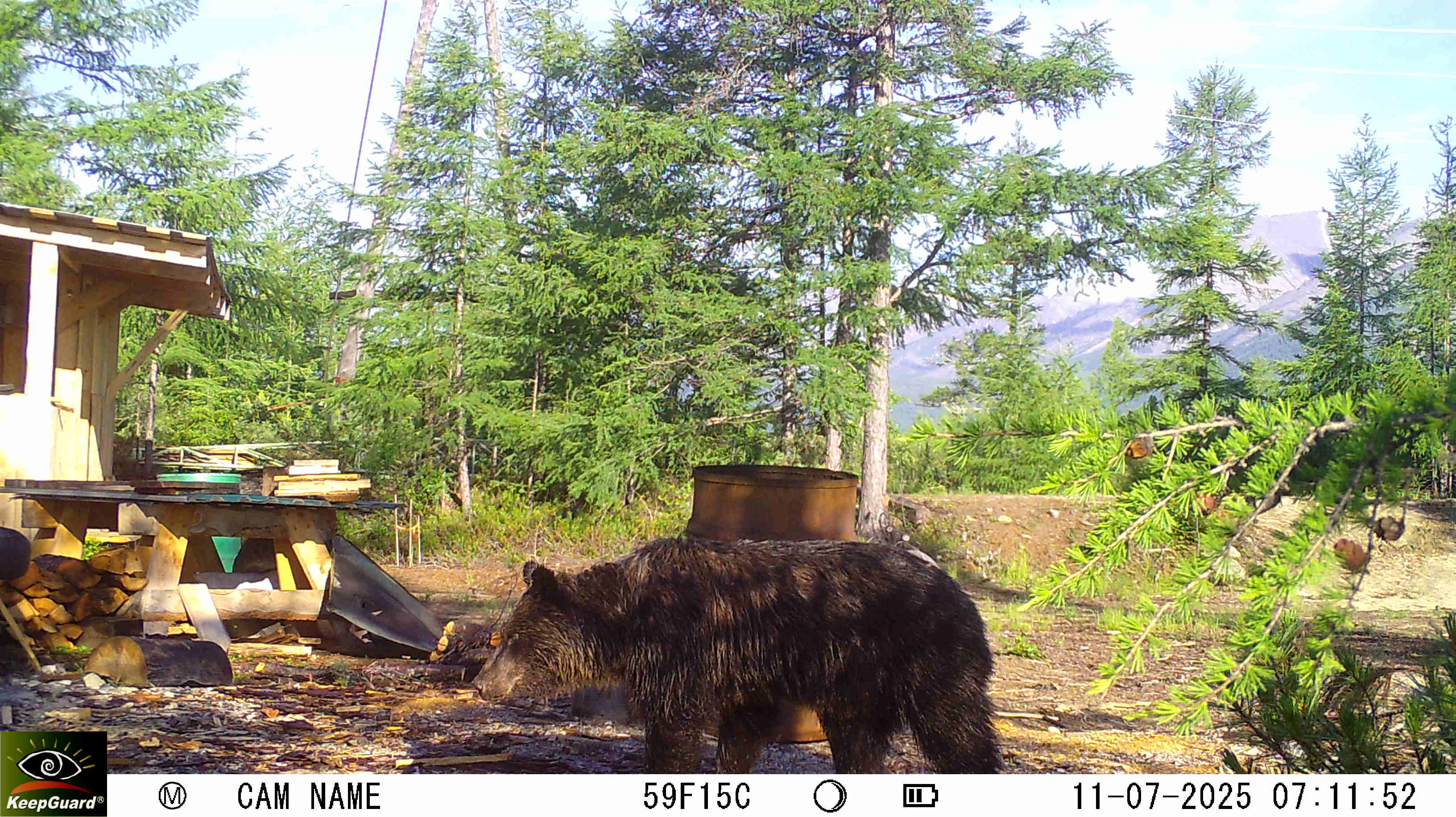 В минувшем июле в кадр фотоловушки на кордоне у озера Большое Леприндо попал годовалый бурый медведь. Это случилось в тот самый тихий час, когда лес только начинает просыпаться, радуясь утреннему солнышку. И тут появился гость- медведь… Медленно, с достоинством обошел территорию вокруг зимовья, обнюхал крыльцо и, конечно, подошёл к мусорному контейнеру — на всякий случай. Гость переглянулся с фотоловушкой — она, не моргнув, сделала снимок. Теперь у нас новый «коллега», патрулирующий территорию в отсутствии сотрудников НП «Кодар».