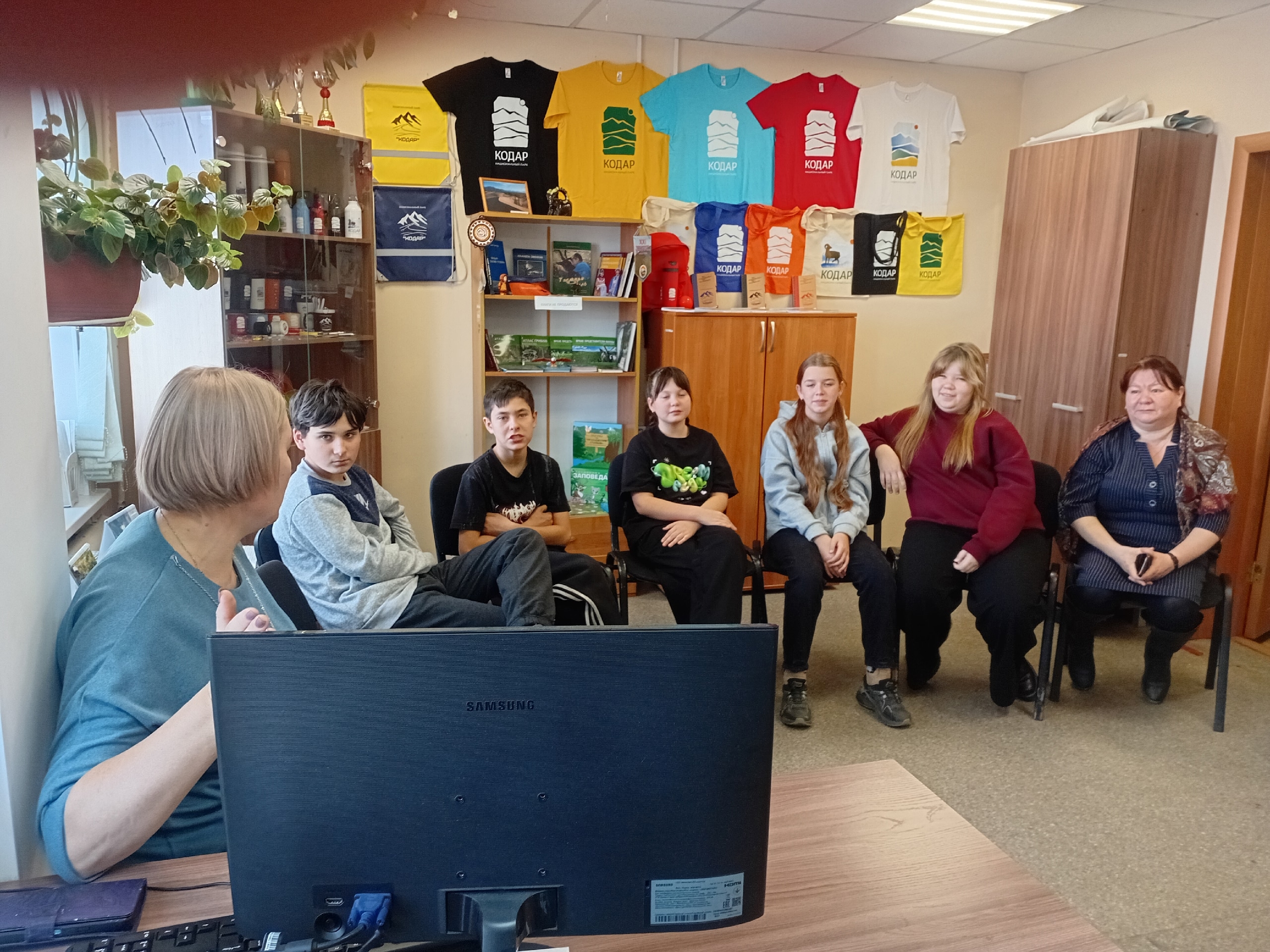 Помимо занятий в библиотеке, дети старших классов посетили офис НП «Кодар». Сотрудники парка рассказали о своей работе, о том, как они следят за состоянием окружающей среды, проводят научные исследования, разрабатывают и реализуют природоохранные проекты, а также организуют экологические экскурсии и мероприятия для посетителей. Ребята узнали о важности профессии эколога и других специальностей, связанных с охраной природы. Так же была проведена презентация, из которой участники беседы узнали об истории создания парка, о редких и исчезающих видах растений и животных, обитающих на его территории, а также о мероприятиях, направленных на их сохранение. Особое внимание было уделено экологическим проблемам и важности бережного отношения к природе. После презентации ребят ждала захватывающая игра "Заповедные знатоки", которая позволила им проверить свои знания о природе и закрепить полученную информацию.
