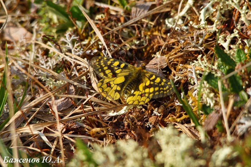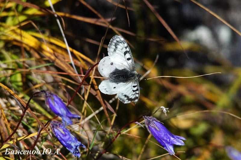 Аполлон Эверсманна – Parnassius eversmanni Menetries, 1850. Эта весьма яркая бабочка – представитель семейства Парусников, славящегося крупными размерами и пестротой своих представителей. На представленном фото – самец аполлона Эверсманна с хребта Кодар, его крылья более желтые, чем у самки. Это типичный альпийский вид. На хребте Кодар аполлон Эвесманна встречается на высотах свыше 1700 м н.у.м. в подгольцовом и гольцовом высотных поясах. Предпочтение же отдает альпийским лужайкам. Считается, что гусеницы этого вида питаются преимущественно на растениях рода Хохлаток. В Забайкальском крае вид внесен в региональную Красную книгу.